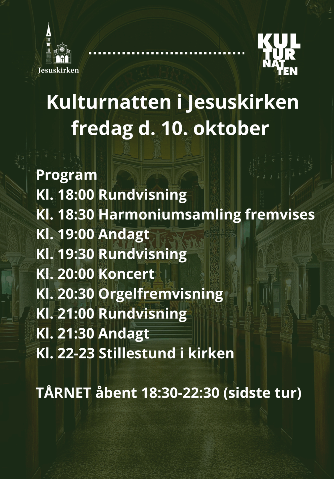 Velkommen til Kulturnatten i Jesuskirken – hvor der er adgang til tårnet, krypten, den historiske samling og kirkens pulpiturer.